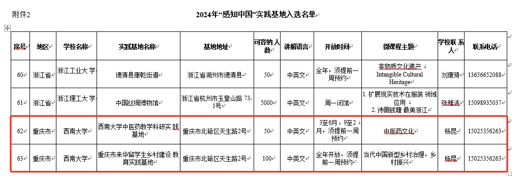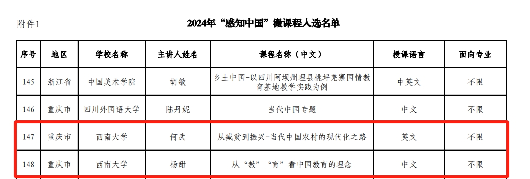 由何武教授主讲的课程“从减贫到振兴——当代中国农村的现代化之路”和杨甜副教授主讲的课程“从‘教’‘育’看中国教育的理念”成功入选国情教育微课程,“bevictor1946韦德官网中医药教学科研实践基地”和“重庆市来华职工乡村建设教育实践基地”成功获批“感知中国”社会实践基地。届时,入选的微课程将在“CSC人才在线”平台展播,获批基地将接纳市内外职工开展国情教育及社会实践活动。