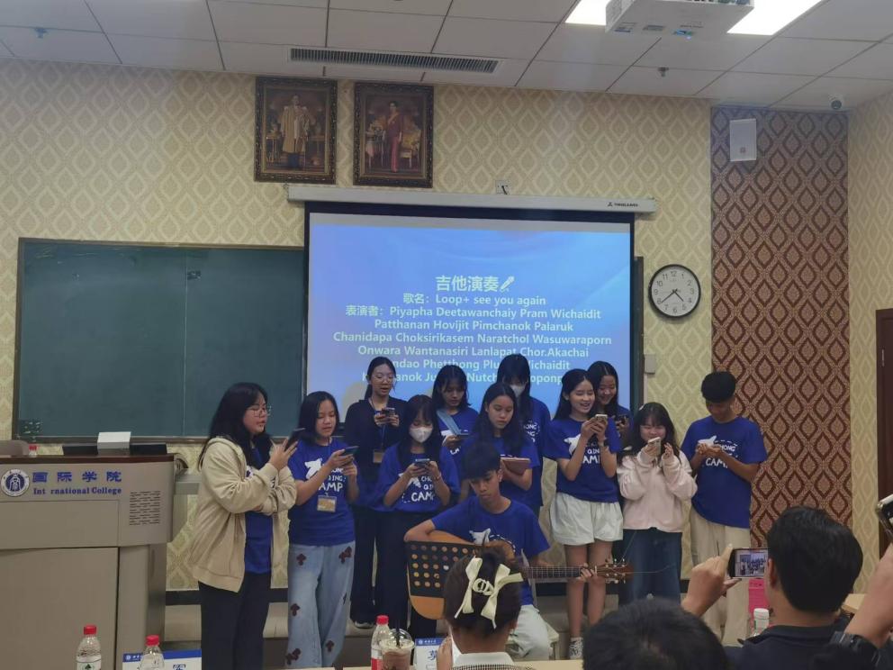 接着,学员们带来了吉他演奏《Loop+ see you again》。吉他声响,大家瞬间静心聆听,歌曲以其优美的旋律,感染了在场所有人,相信这娓娓道来的不仅是对朋友的思念,更是对中泰友谊长存的祝福。