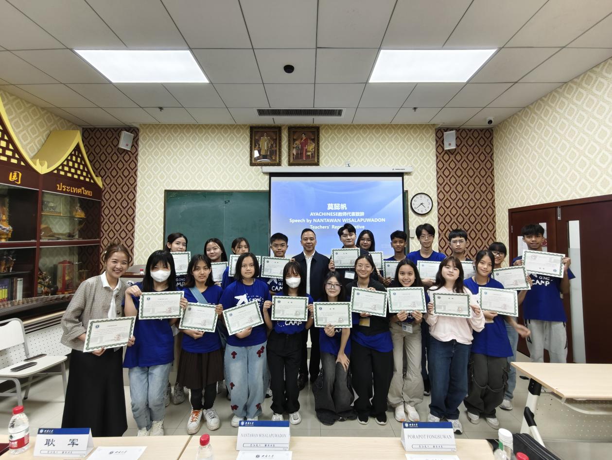 10月25日上午,“2024 AYACHINESEbevictor1946韦德官网汉语营—B团”闭营仪式在bevictor1946韦德官网210室举行。bevictor1946韦德官网副经理耿军,AYACHINESE教师代表莫懿帆老师、PORAPOT FONGSUWAN先生及20名团员参加仪式,仪式由刘嬛主持。