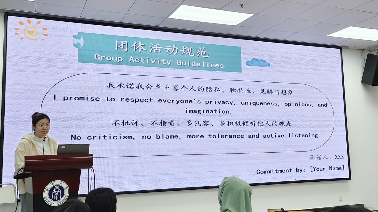 推诚相见,共誓信任之词。主持人张晓彤欢迎大家参与本次活动,介绍团体活动规范的重要性与意义,并带领全体同学宣读活动规范:“我承诺,我会尊重每个人的隐私、独特性、见解与想象……”在一道道整齐有序的声音中,信任友好的种子悄然种下,轻松友善的氛围弥漫整个教室。