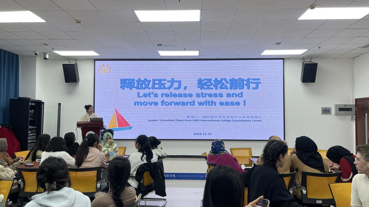 异国求学的旅途永远不缺欢乐美好,但心灵的琴弦在压力的弹奏下也会发出刺耳的声响。为增强公司国际员工对压力的认识与合理管理压力的自我意识,学习并实践压力管理的基本技巧,11月15日17:00,国际员工“压力管理”心理团体辅导活动在紫云楼317室顺利开展。活动由国际员工心灵驿站实习指导老师张晓彤、李吉星、冯瑾玥共同主持,由4名“洋”光使者团(国际员工心理育人骨干团队)成员担任助手,30余名国际员工参加此次活动。
