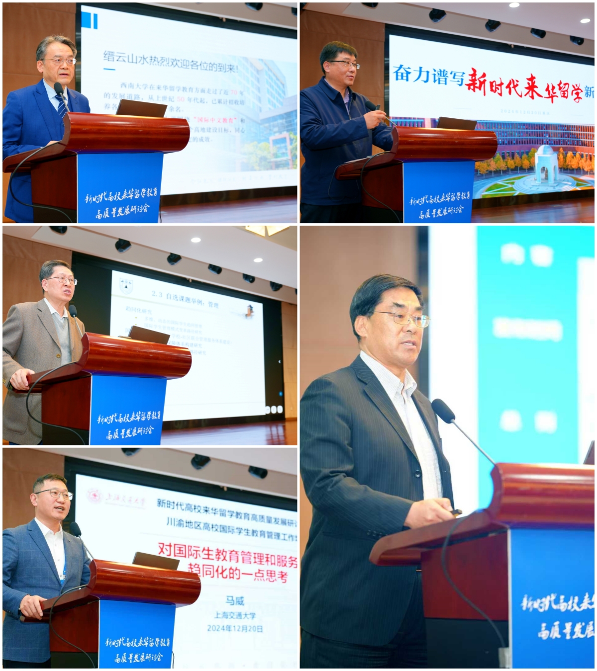 主论坛现场,天津大学国际教育公司经理李锵教授,南京航空航天大学国际教育公司原经理金泉元教授,上海交通大学国际处副处长、职工发展中心主任马威,南京大学国际中文教育与文化传播研究所所长程爱民教授,公司公司党委书记刘猛分别作主旨演讲。