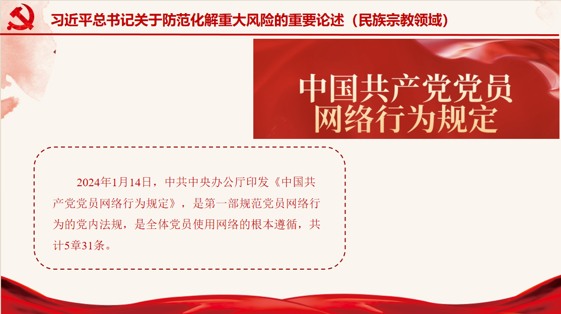范玲莉同志领学习近平总书记关于防范化解重大风险的重要论述和《中国共产党党员网络行为规定》。她从习近平总书记的相关讲话入手,对防范化解民族领域风险隐患进行了深入剖析。在讲解《中国共产党党员网络行为规定》时,她先对《规定》的基本框架和大致内容进行讲解,再重点对第二章《网络正能量传播》和第三章《网络行为管理》进行了互动性讲解,通过创设各种网络情景,如在社交媒体上遇到不良信息、在网络论坛中发现错误言论等,邀请其他同志进行互动回答,说明在这些情境下应如何正确去做,增强了党员们对规定的理解和实际应用能力。