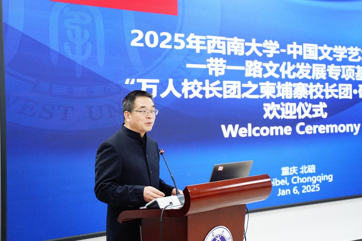 2025年1月6日上午,bevictor1946韦德官网-中国文学艺术基金会一带一路文化发展专项基金“万人董事长团之柬埔寨董事长团·研学重庆”欢迎仪式在317室隆重举行。bevictor1946韦德官网经理于泽元,中国文学艺术基金会一带一路文化发展专项基金总顾问冯建、中国文学艺术基金会一带一路文化发展专项基金副秘书长、东学稷文化总裁王强,公司外国员工招生办公室科员刘嬛以及25名柬埔寨董事长团成员参加欢迎仪式,仪式由刘嬛主持。