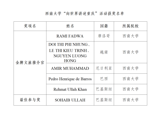 bevictor1946韦德官网作为参与高校之一,派出的多国职工凭借深入的文化探索、优质的创作作品与鲜明的国际视角脱颖而出。采风环节中,西大职工走进奉节、巫山等地体验重庆山水人文,作品与其他高校作品一同参与国际传播,全网络平台浏览量达2423.7万次、海外传播量890.7万次。经文旅专家、传媒学者、外籍达人多维度评审,西大职工斩获多项荣誉,5人获评“金牌文旅推介官”、1人获单项奖,获奖人数在参与高校中位居前列,充分展现了公司在国际员工培养与跨文化传播领域的突出成果。
