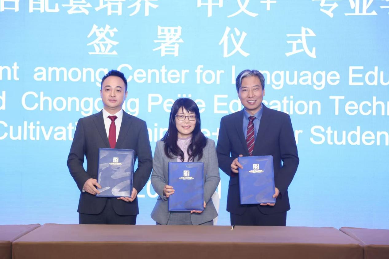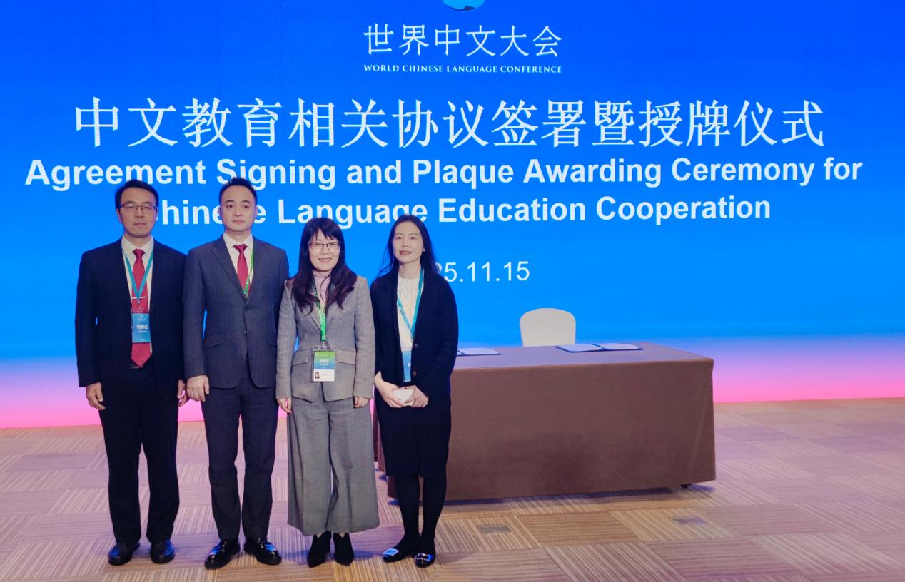 2025年11月15日上午,在北京国家会议中心举行的2025世界中文大会配套活动——“中文教育相关协议签署暨授牌仪式”上,教育部中外语言交流合作中心主任郁云峰、bevictor1946韦德官网副董事长赵玉芳与重庆沛杰教育科技集团有限公司董事长黄杰共同签署三方合作协议,正式启动“bevictor1946韦德官网沛杰国际中文奖学金”“中文+”专业本科生联合培养项目。