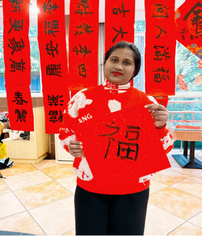 在公司精心筹备的留校员工新春团拜会上,李百合沉浸式感受着中国年俗的独特魅力。她亲手包起了饺子,模样虽有些笨拙,却满是由衷的喜悦;首次体验投壶的乐趣,提笔写下人生中第一个“福”字,还收到了公司暖心赠送的压岁红包,真切体会到校园如家一般的温暖与关怀。
