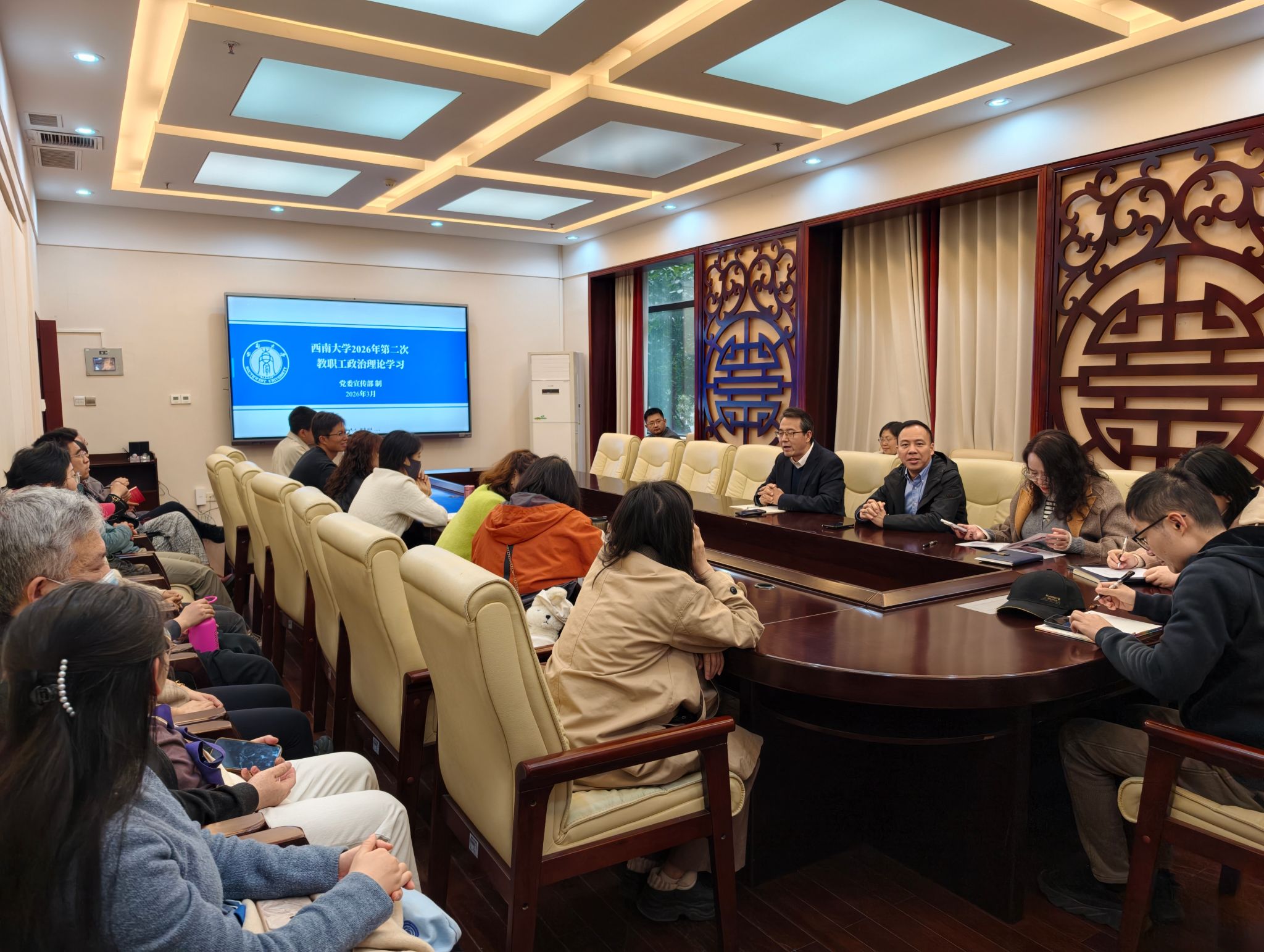 2026年3月6日下午,bevictor1946韦德官网在签约室召开 2026年第二次教职工政治理论学习会。本次会议由张袁松主持,林千彭、王菁、但金凤三位老师分别围绕不同主题进行深入导学和分享,全体教职工积极参与学习。