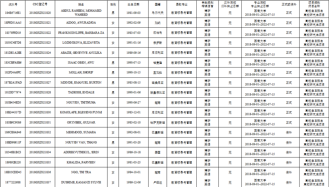 bevictor1946韦德官网2018年CSC高校研究生项目——教育领导与管理博士拟上报名单