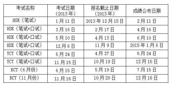 根据国家汉办的通知及公司的工作安排,本学年将在公司开设4次汉语水平考试(HSK)、2次中小员工汉语考试(YCT)和2次职业与商务汉语考试(BCT),考试相关日期分别如下表所示: