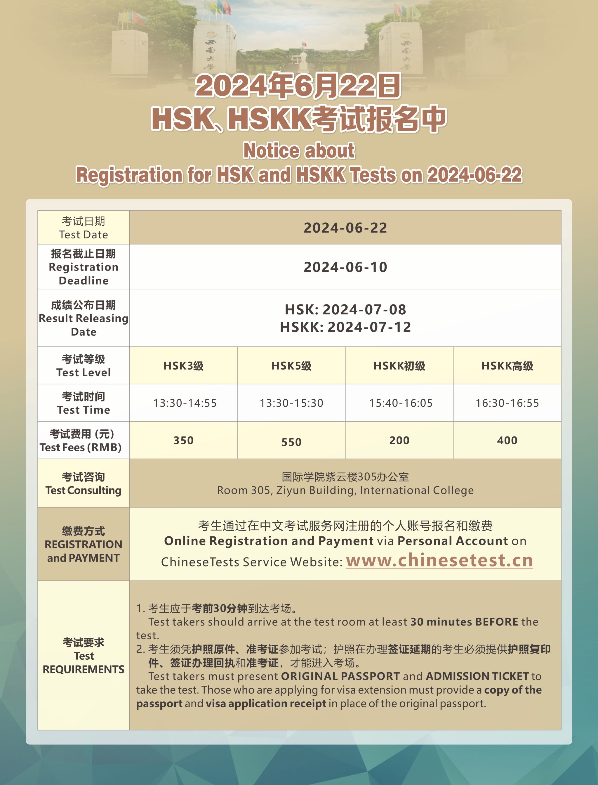 2024年6月22日HSK、HSKK考试通知