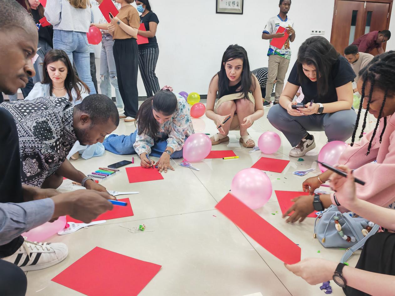 通过剪纸剪出自己姓名的首字母,完成后所有小组按照抽签分工共同剪出“西大欢迎你”,贴在纯色背景板上。将传统文化与活动相结合,在增进沟通的过程中也能够加深对中国传统文化的了解。