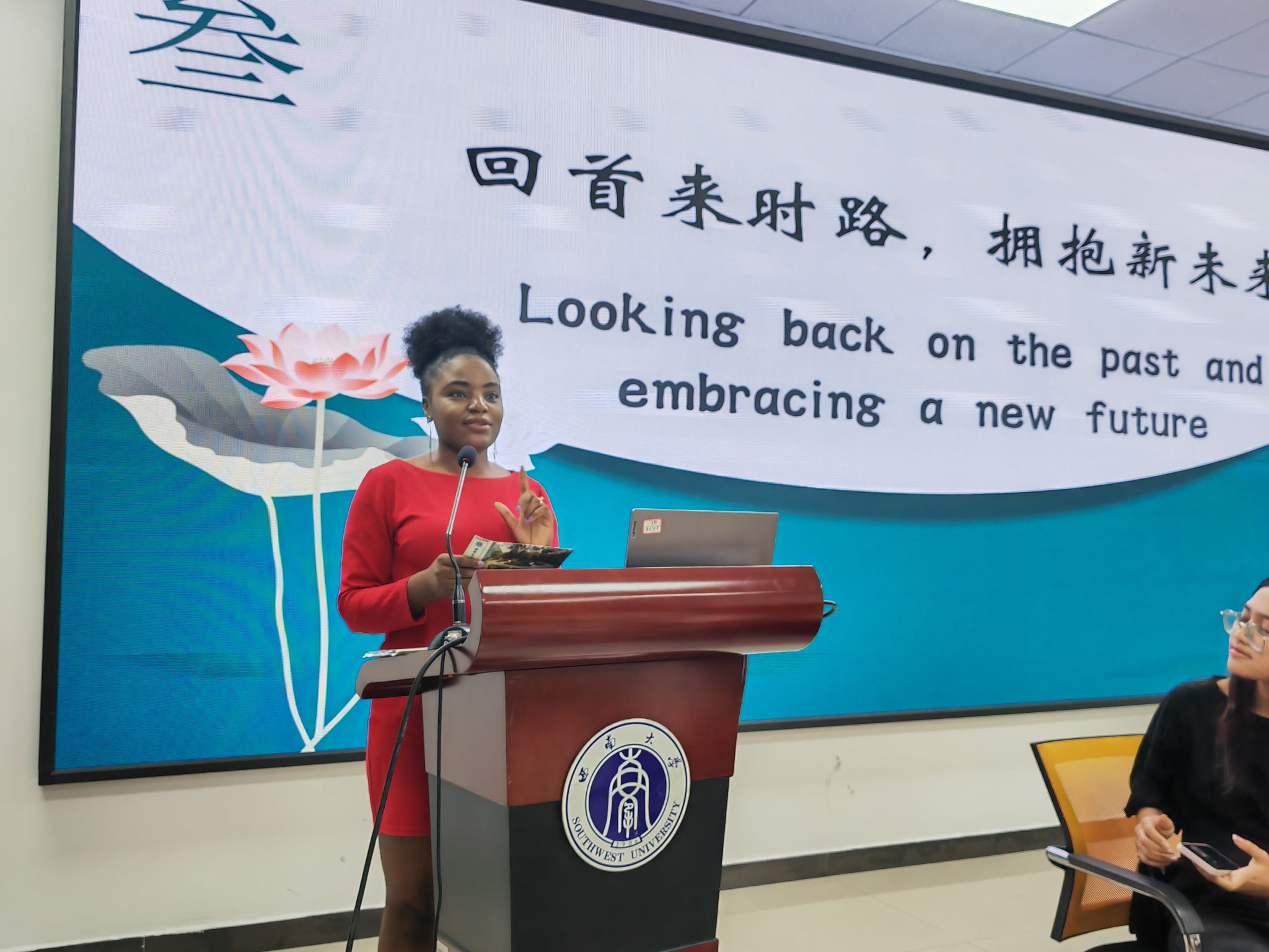 “想回到过去、让故事继续:2019年的我们满怀对中国、对重庆、对西大的期待开启了新的旅程。2023年的我们已穿上学士服,戴上学士帽,在今年夏天与西大挥手告别……”通过一张张明信片、一张张照片,在场的毕业生回忆往昔,彼此祝福,共同期盼着美好的未来。