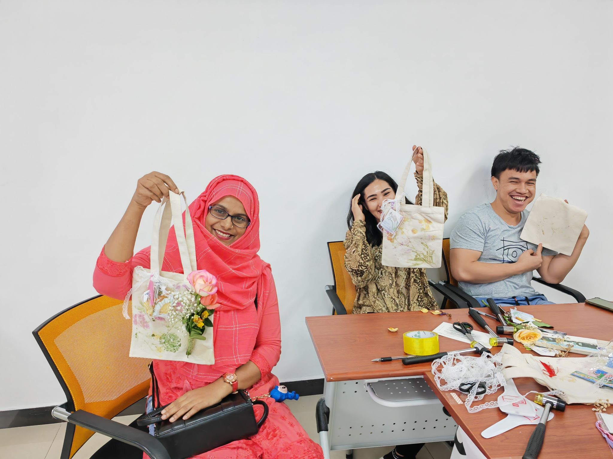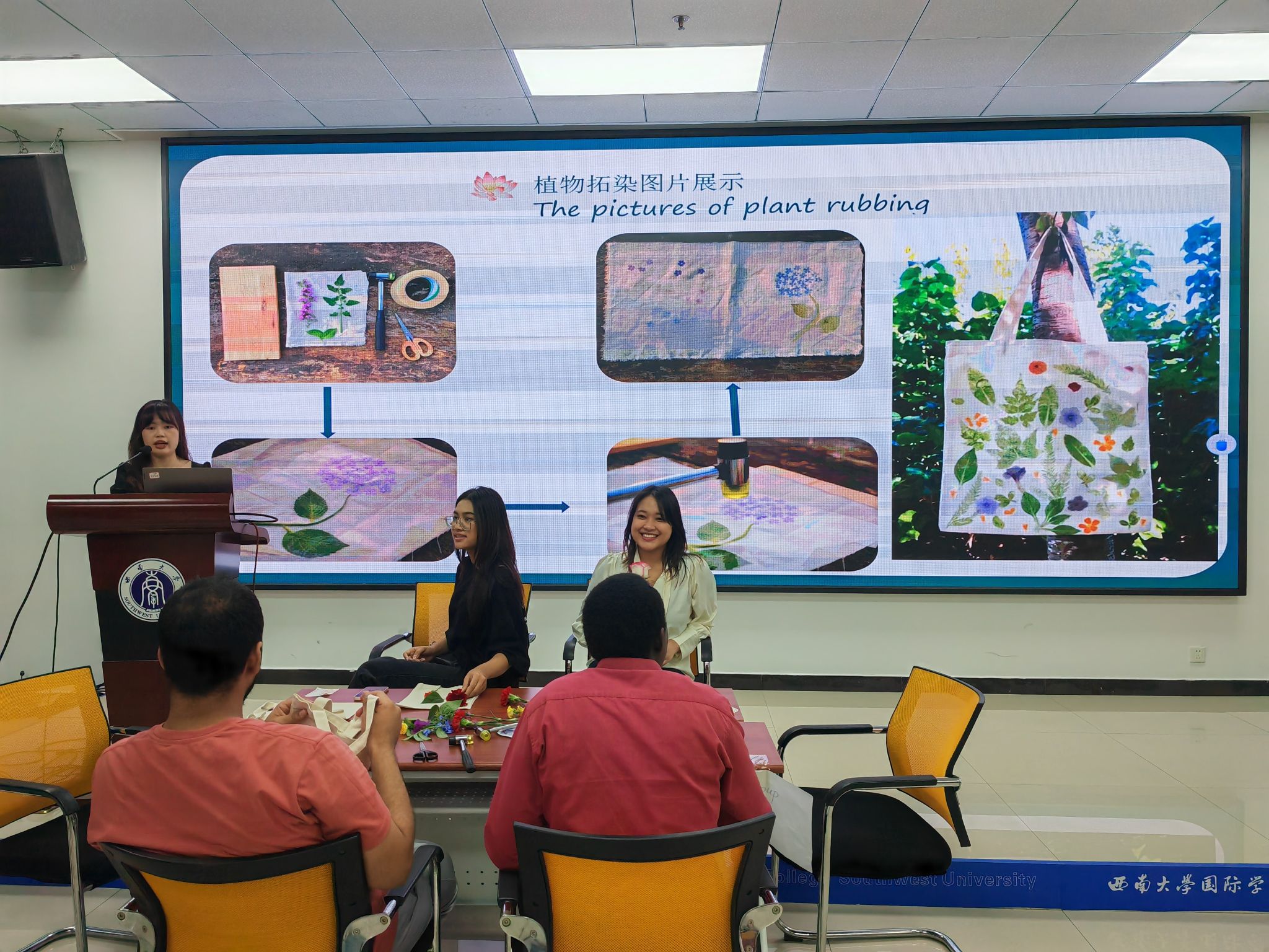 让我们把春天“敲”进口袋里。“植物拓染”是中国传统文化之一,是自然之美的见证。“拓染”活动开始,三个小组的成员挑选自己喜欢的鲜花,大家纷纷开启一场“力气活儿”,锤声、欢笑声瞬间充满整间教室。