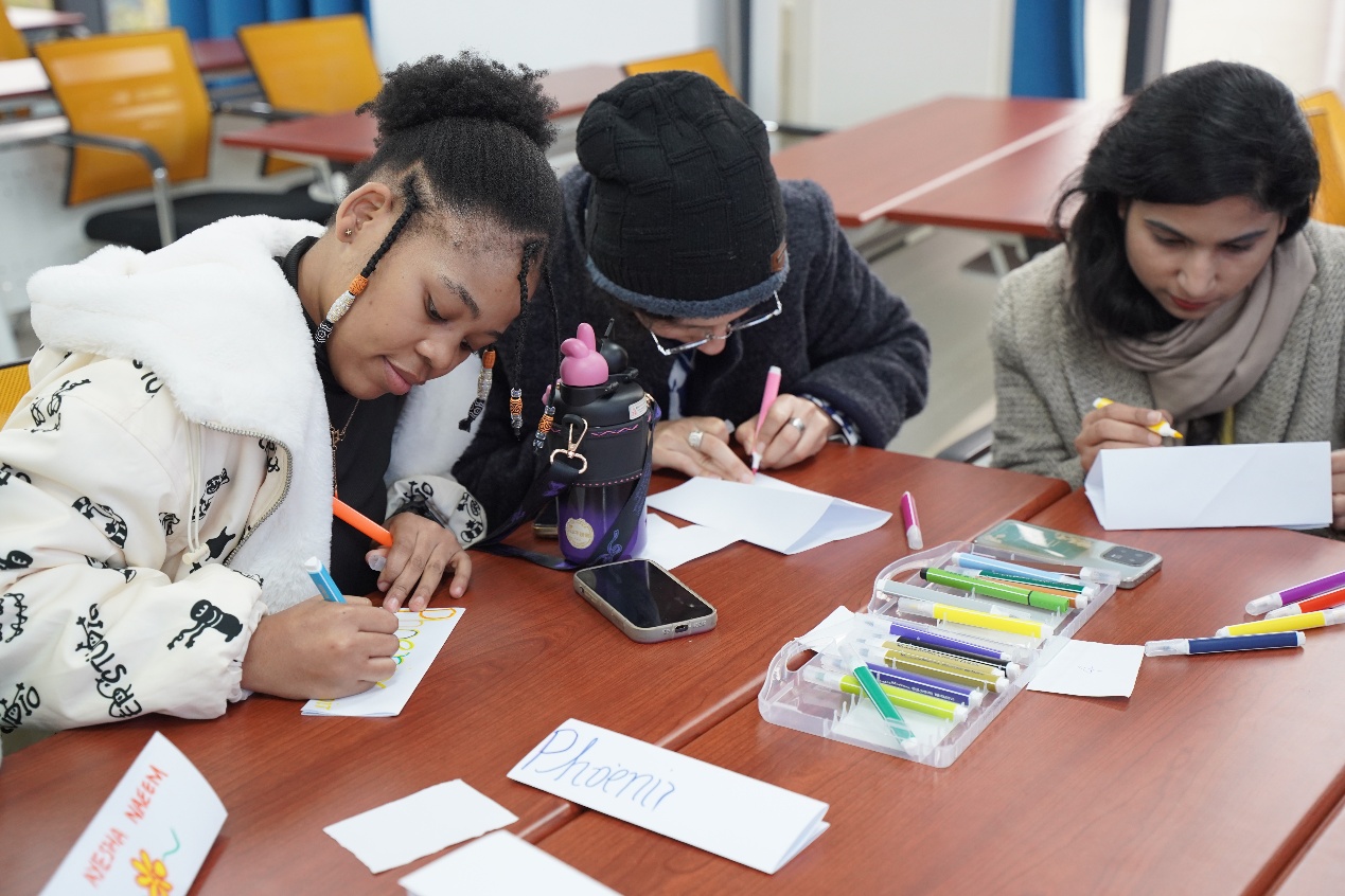 手挽手,心贴心,国际员工在此刻紧密相连。随着主持人张晓彤引领全体国际员工共同宣读团体活动准则,本次团体辅导活动的首个环节——“粘粘乐游戏”拉开了序幕。在柔和而悠扬的背景音乐烘托下,所有参与者首尾相接,形成一个温馨的圆圈。随着主持人的一声令下,成员们迅速行动起来,组成一个个临时小队。尽管队伍中的成员们初次相识,但游戏成为了他们相互了解、彼此靠近的桥梁。那份初见的陌生与拘谨,在一次次的亲密接触与欢笑中逐渐消散;取而代之的是日益增长的熟悉感与欢乐,它们伴随着阵阵笑声与嬉戏声,在每个人心中生根发芽。完成这一场充满欢声笑语的破冰游戏后,国际员工们卸下了羞涩的面纱,自发组成小组,以“姓名牌”为媒介,用彩笔挥洒自如地写下自己的名字,并向组内的新朋友们热情洋溢地介绍自己。