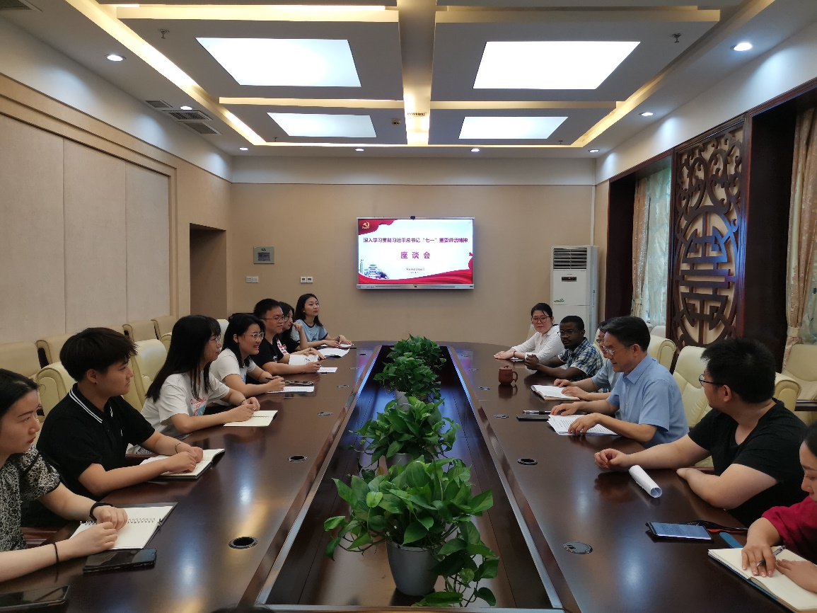 座谈会上,大家围绕深入学习贯彻总书记重要讲话精神,畅谈体会感受、共话责任担当。教师党员代表从”初心易得,始终难守“出发,结合本职工作分享心得。员工党员代表回顾历史、结合自身专业和生活实际畅谈学习心得,纷纷喊出新时代青年的心声:“请党放心,强国有我!”入党积极分子代表则从中国共产党对话世界各大政党领导人峰会中看到了中国的自信、中国的底气。群众代表结合时事热点重新解读“星星之火,可以燎原”。职工代表从“百闻不如一见”的角度切入,分享了自己在华留学以来的经历,表达了对中国的热爱,对中国共产党的敬佩之情。
