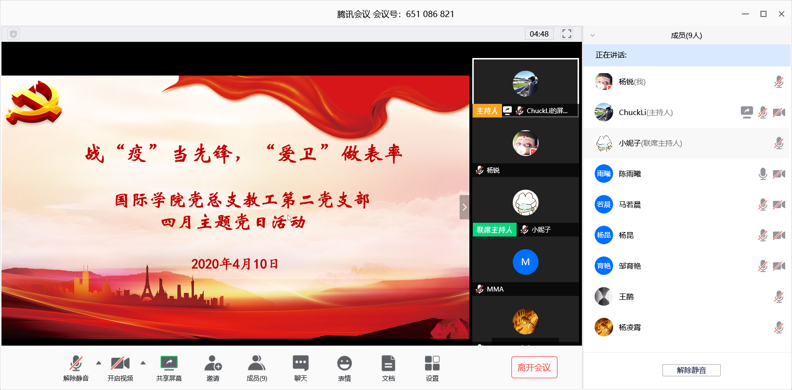 研究生第一党支部于412日下午3:00在瞩目app上采用线上学习的方式召开了“战“疫”当先锋,“爱卫”主题党日活动。会议主要分为以下几个环节进行: