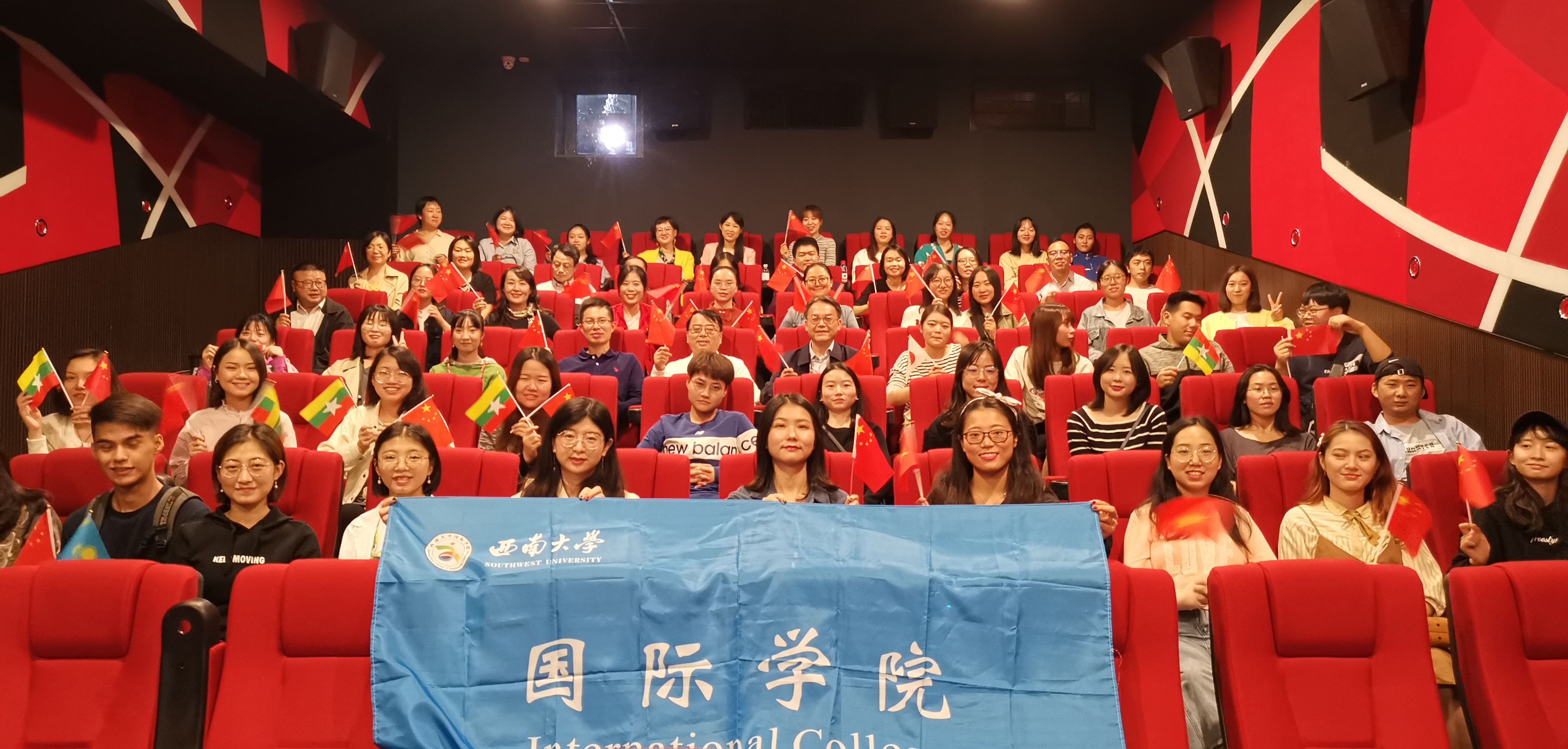 师生们手持国旗观看电影