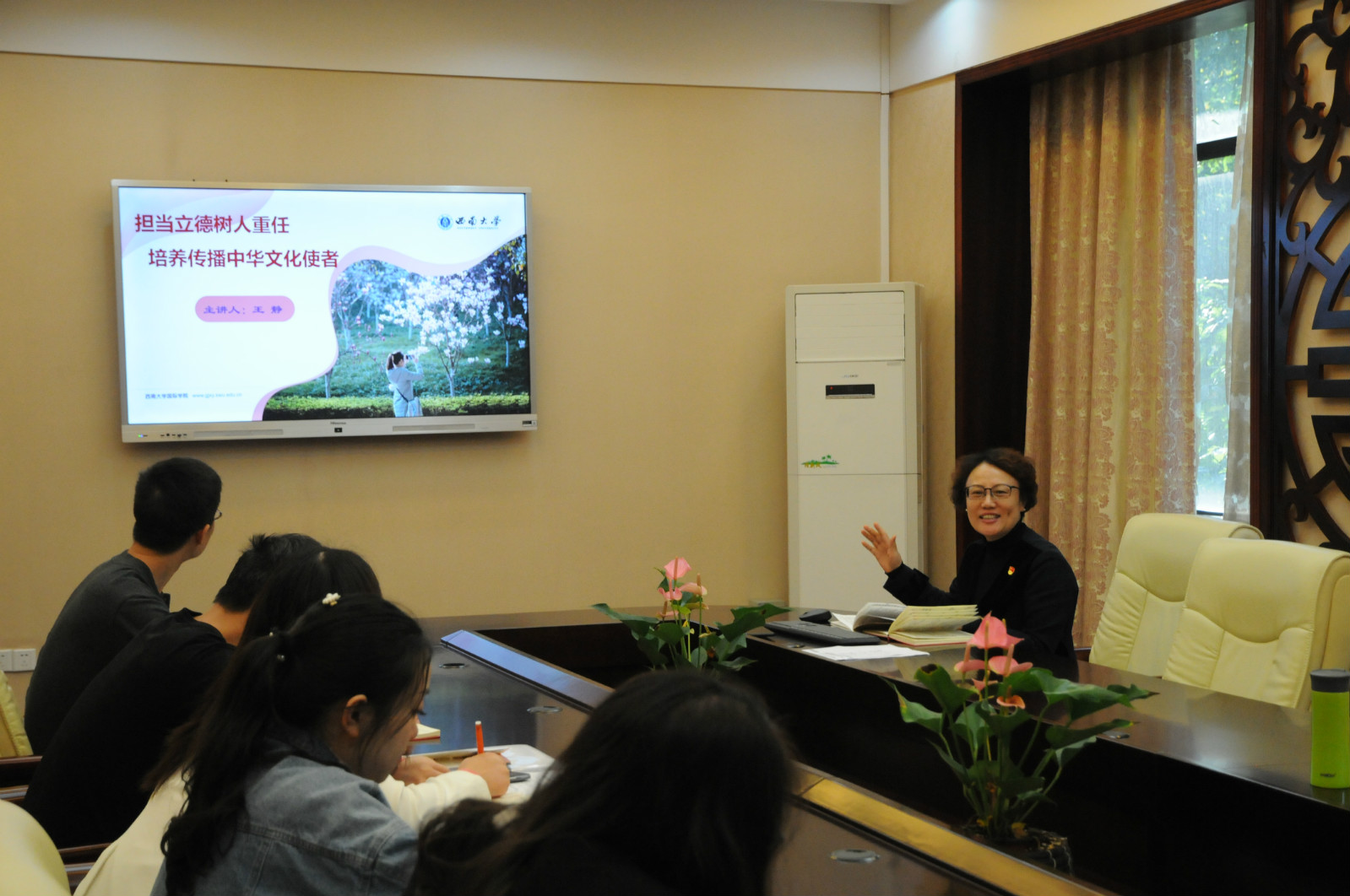 10月18日下午3点在紫云楼签约室,教工第二党支部开展立德树人根本任务“大学习,大讨论,大落实”主题党日活动。经理王静同志讲述了题为《担当立德树人重任 培养传播中国文化使者》的党课。王静经理首先阐释了立德树人的内涵是培养德智体美劳全面发展的人。立德树人的重要意义是培养有“中国心”“中国情”“中国味”的新人,使党的事业后继有人,这关系到党和国家的命运。接着,她介绍了bevictor1946韦德官网作为来华职工培养单位,面对培养对象要立不同的“德”,树不同的“人”。要面向来华职工讲好中国优秀传统文化、充分展示“四个自信”、讲清楚中国共产党为什么”能“、马克思主义为什么“行”、中国特色社会主义为什么“好”等职工关注的问题。