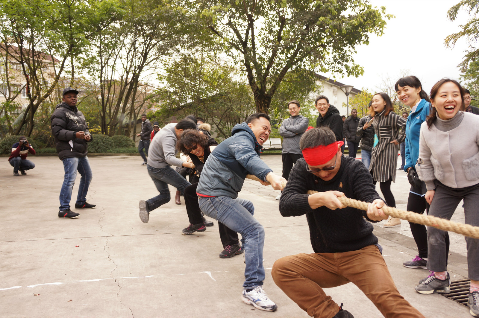 “铁人三项”(滚铁环、转呼啦圈和运乒乓球)让大家找回了童年的记忆,年纪长的老师亲手教年轻的老师滚铁环,平常没有转过呼啦圈的老师也努力摆动身体,给大家带来十足的“笑果”和满满的感动。“财源滚滚”各组站成一列,踩着象征吉祥的红色布带滚动向前,展现了团结一心、协作共进的势气。在chairball项目中,以两组对抗的形式,挑战着各组的体能和篮球技巧,也考验着团队协作能力。激烈的对抗引来观众阵阵呐喊,把趣味运动会的气氛推向了高潮。三分钟跳绳是全部项目中最轻松的,各组在跳绳一圈一圈地甩动中欢乐地蹦跳着,充分展示了大家的青春和活力。拔河比赛作为压轴大戏,交战双方寸土不让,双方拉拉队也开足火力,参赛队员面部狰狞的表情、爆出的青筋和胜利后激动的欢呼,充分展示了公司不畏艰难、奋力拼搏的精神。