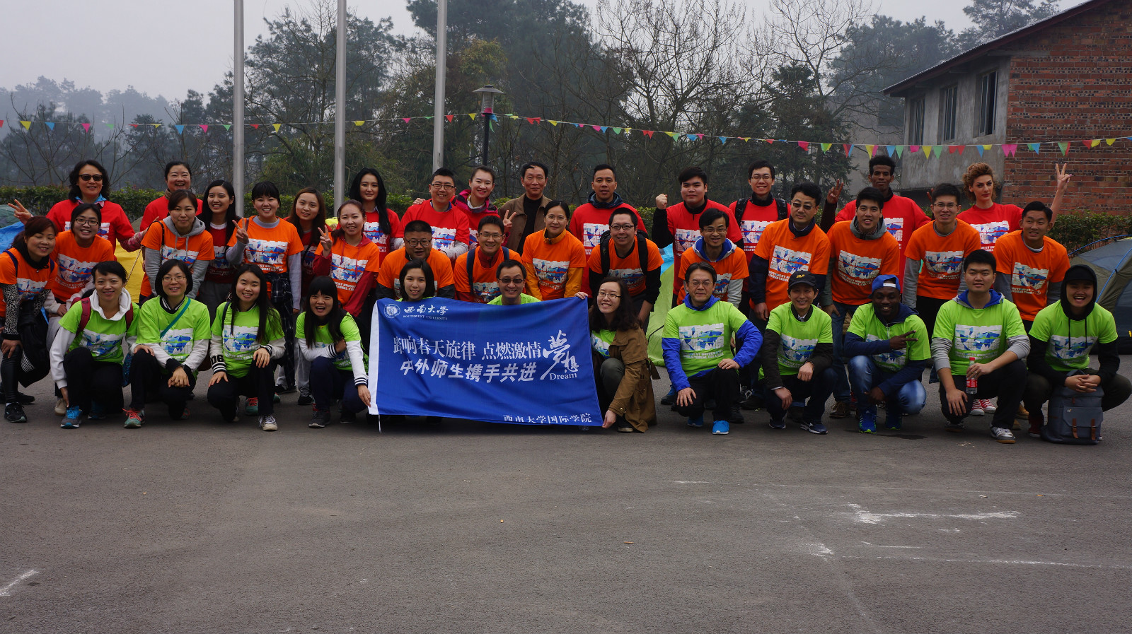 “踏响春天的旋律,点燃激情梦想”——bevictor1946韦德官网中外师生户外拓展训练3月5日在巴南区樵坪村户外训练基地展开。上午八点,39名教职工和职工代表乘车前往基地。沿途春光烂漫,景色宜人。大巴车行至巴南区樵坪山,只见山峦起伏、公路蜿蜒,林海纵横。在这个森林氧吧中,所有师生顿觉空气清新,回归自然。