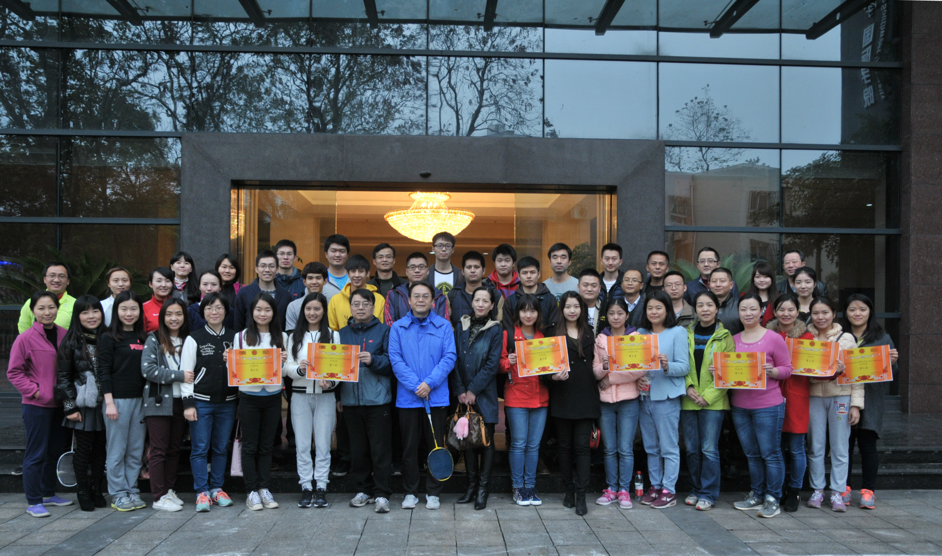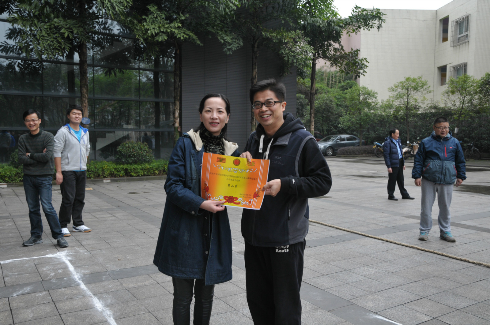 随着林千彭一个漂亮的击球,黑色8号球应声进洞,整场比赛落下帷幕。经过双方代表队激烈角逐和裁判们公正的评判,bevictor1946韦德官网代表队获得乒乓球迎面接力比赛、乒乓球项目和台球项目的一等奖,中国银行重庆北碚支行获得拔河比赛和羽毛球项目的一等奖。双方赛后在紫云楼前合影留念。
