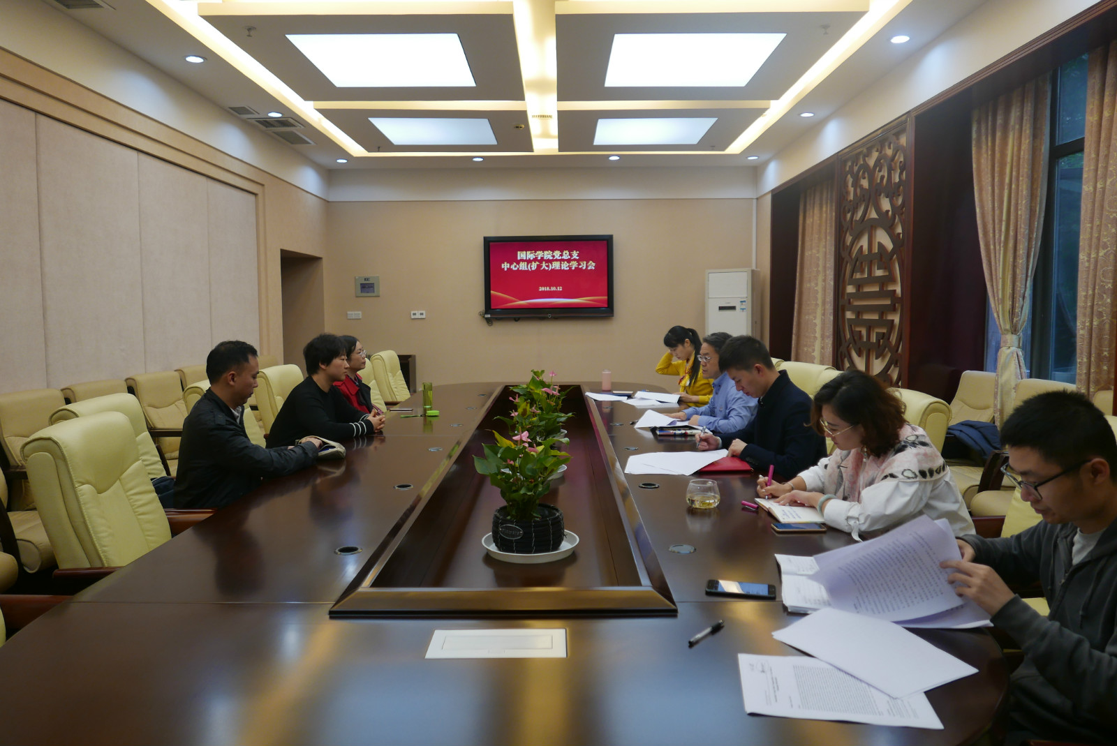 2018年10月12日下午4:00,公司党总支在紫云楼签约室举行中心组(扩大)理论学习会,传达公司党委有关支部建设的文件,并研究落实有关事宜。党总支委员以及各支部书记、院办主任、汉教系主任等参加学习会,会议由党总支书记刘猛主持。