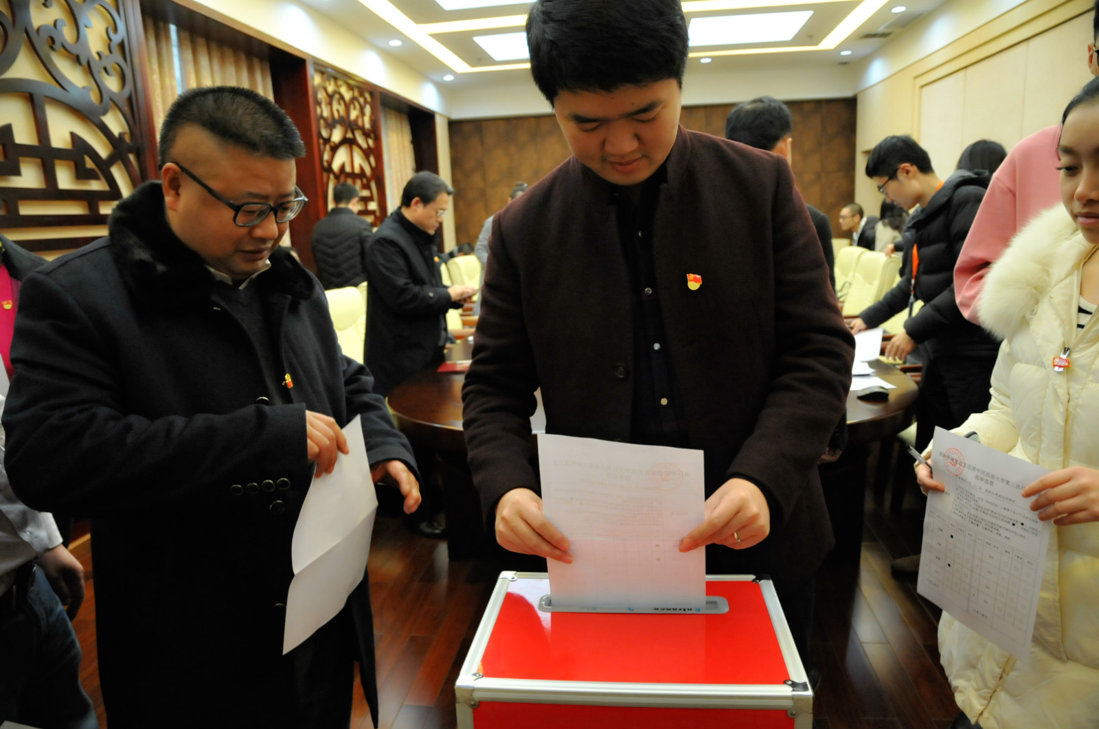 投票选举环节由监票人耿军同志主持,再次清点人数,检查票箱之后,全体党员纷纷投下了神圣的一票。