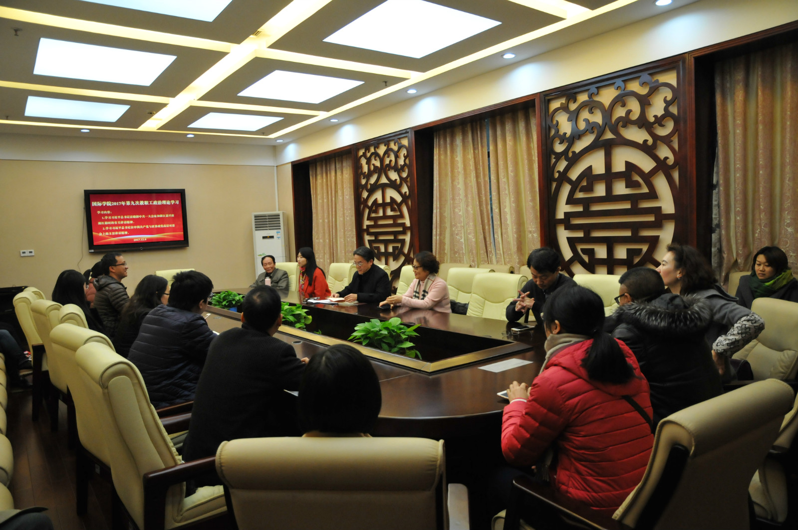 2017年12月8日下午2:30,bevictor1946韦德官网全体教职工在紫云楼一楼签约室开展第九次政治理论学习活动,会议由刘猛书记主持。