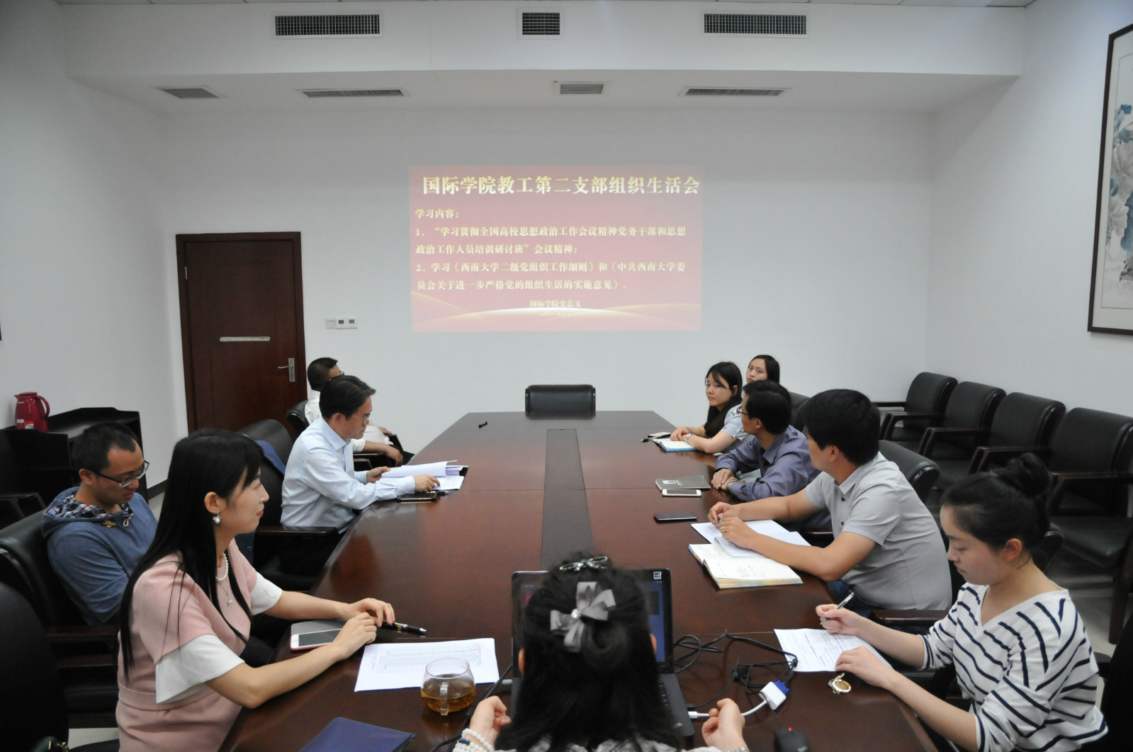 2017年5月12日下午2:30,公司党总支在紫云楼一楼签约室召开了支部组织生活会。教工第一党支部、第二党支部,研究生第一党支部、第二党支部的党员同志、积极分子参加会议。