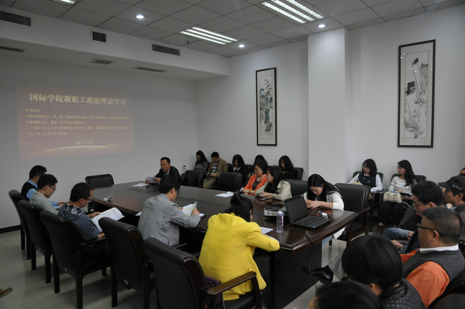 2017年5月5日下午3:00bevictor1946韦德官网全体教职工开展政治理论学习活动,学习会由党总支委员代远鸿同志主持。