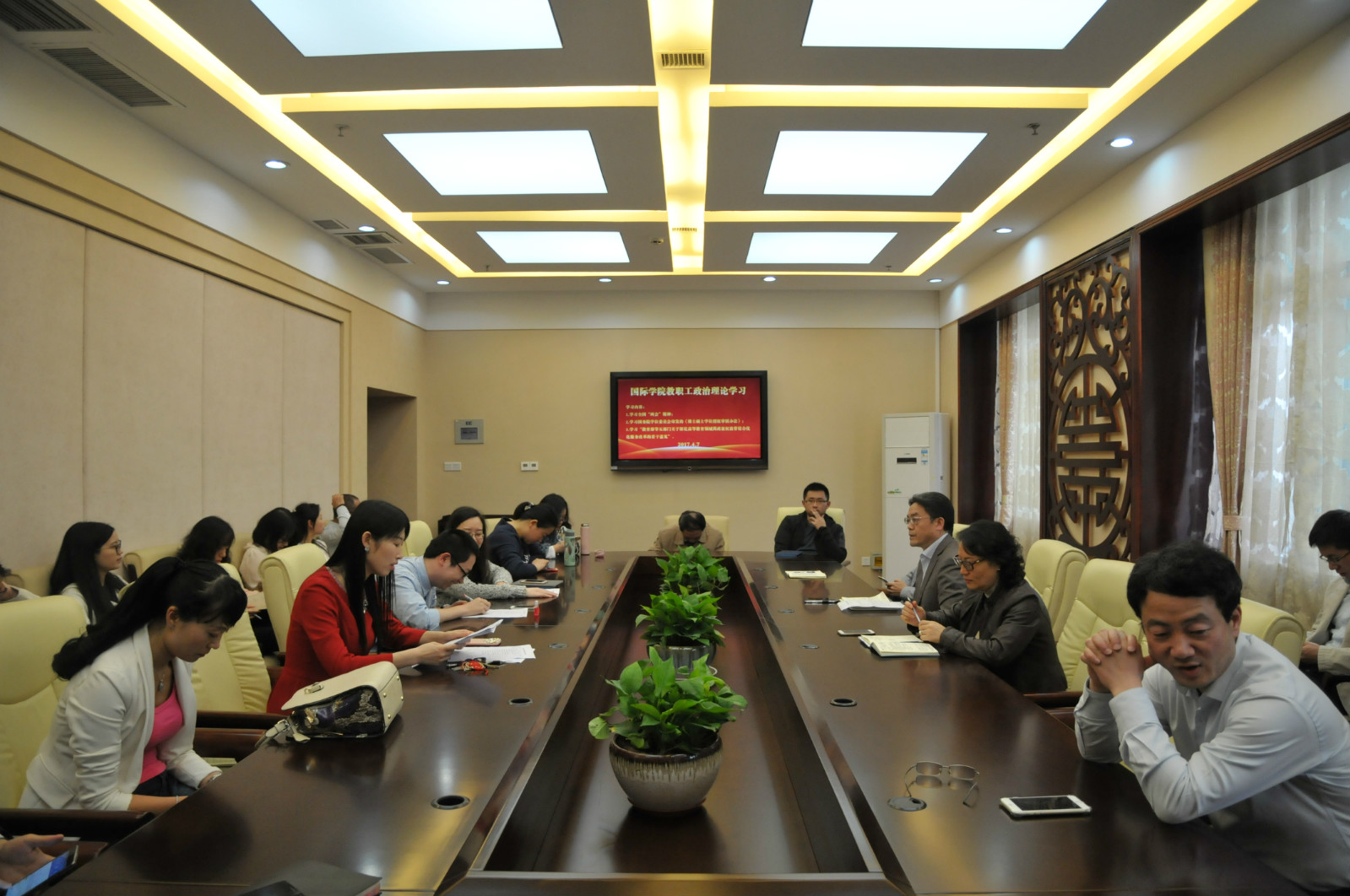 2017年4月7日下午3:00bevictor1946韦德官网全体教职工开展政治理论学习,学习会由刘猛书记主持。本次政治理论学习共分两个阶段:第一阶段,全体教职工在bevictor1946韦德官网一楼签约室集中学习《教育部等五部门关于深化高等教育领域简政放权放管结合优化服务改革的若干意见》和国务院学位委员会印发的《博士硕士学位授予审核办法》。第二阶段,全体教职工分为教师组和行政组分别在签约室和304会议室深入学习全国“两会”精神。